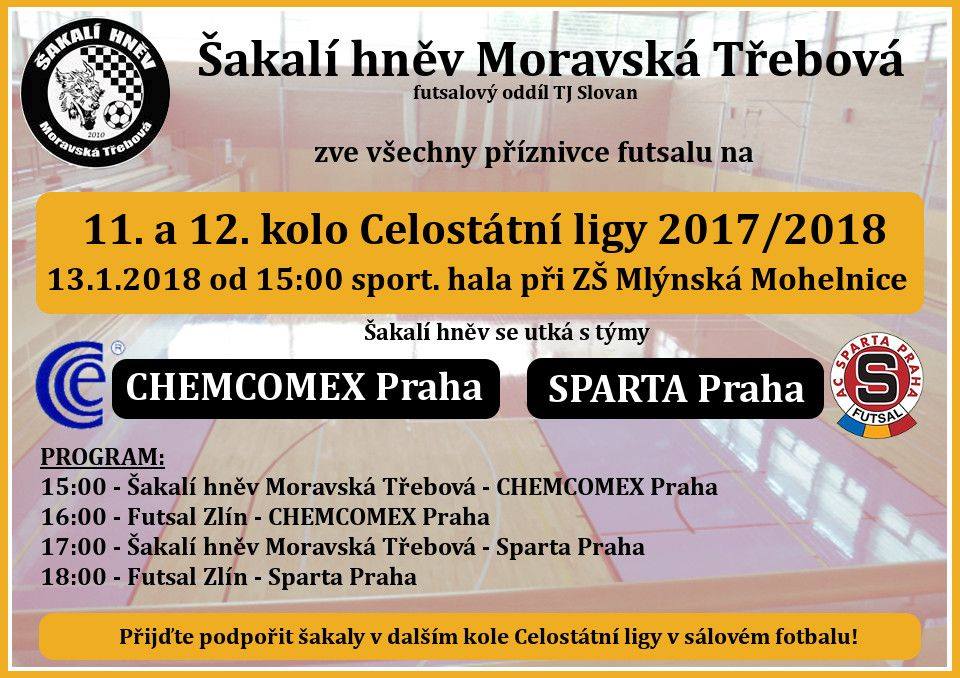 Šakalí hněv Moravská Třebová Vás srdečně zve na 11. a 12. kolo Celostátní ligy 2017/2018 v sálovém fotbale, které se uskuteční v sobotu 13. ledna 2018 od 15 hodin ve sportovní hale při ZŠ Mlýnská v Mohelnici.