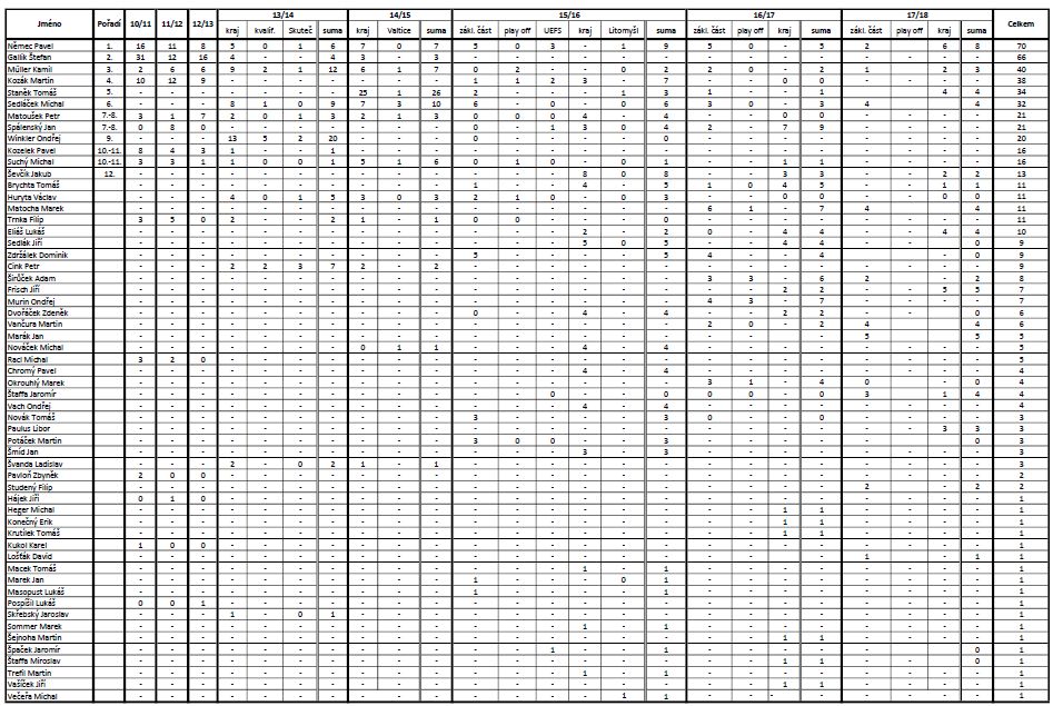 Historická tabulka střelců – celkem: