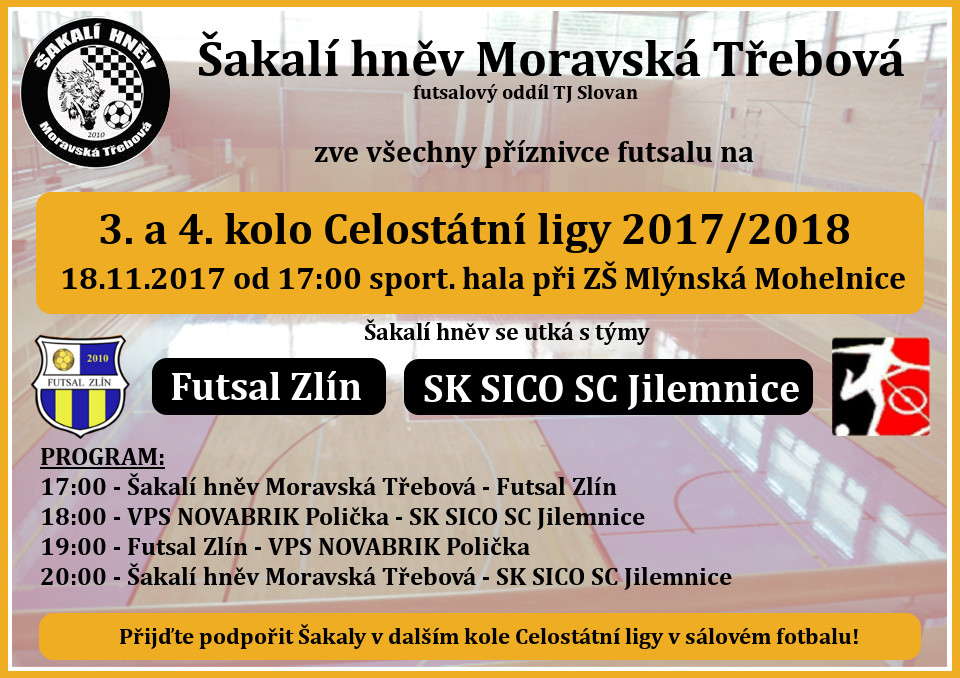 Turnaj pod pořadatelskou taktovkou Šakalího hněvu Moravská Třebová za účasti týmů Futsal Zlín, VPS Novabrik Polička a SK SICO SC Jilemnice je tu!!! Výkop prvního utkání v 17:00. Občerstvení zajištěno, vstup volný.